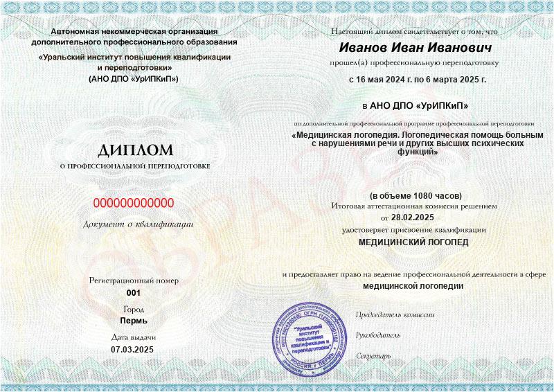 Диплом о профессиональной переподготовке с присвоением квалификации «Медицинский логопед»Диплом действует на территории всей России и признается государственными и частными организациями